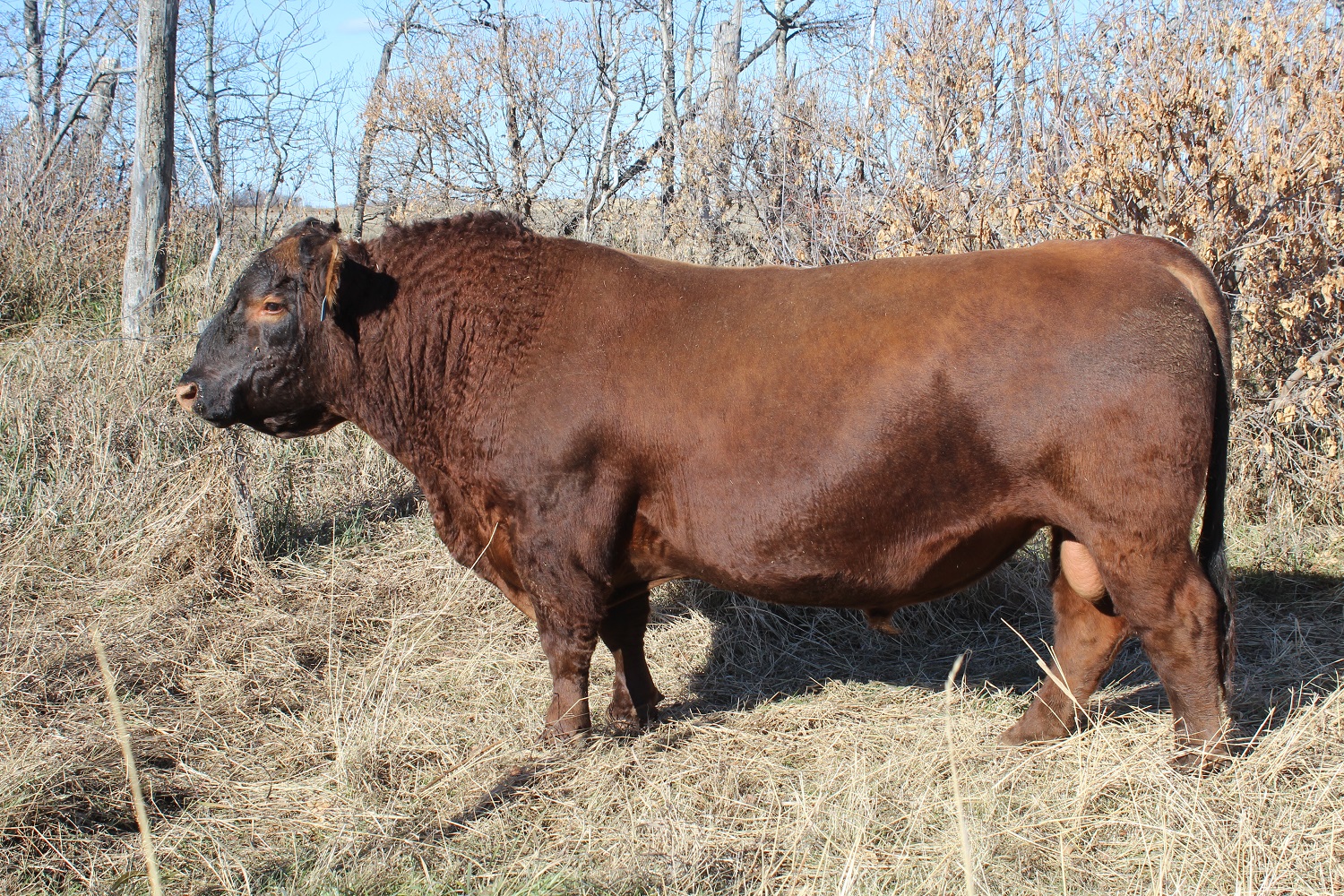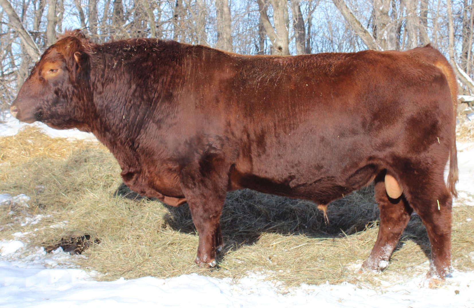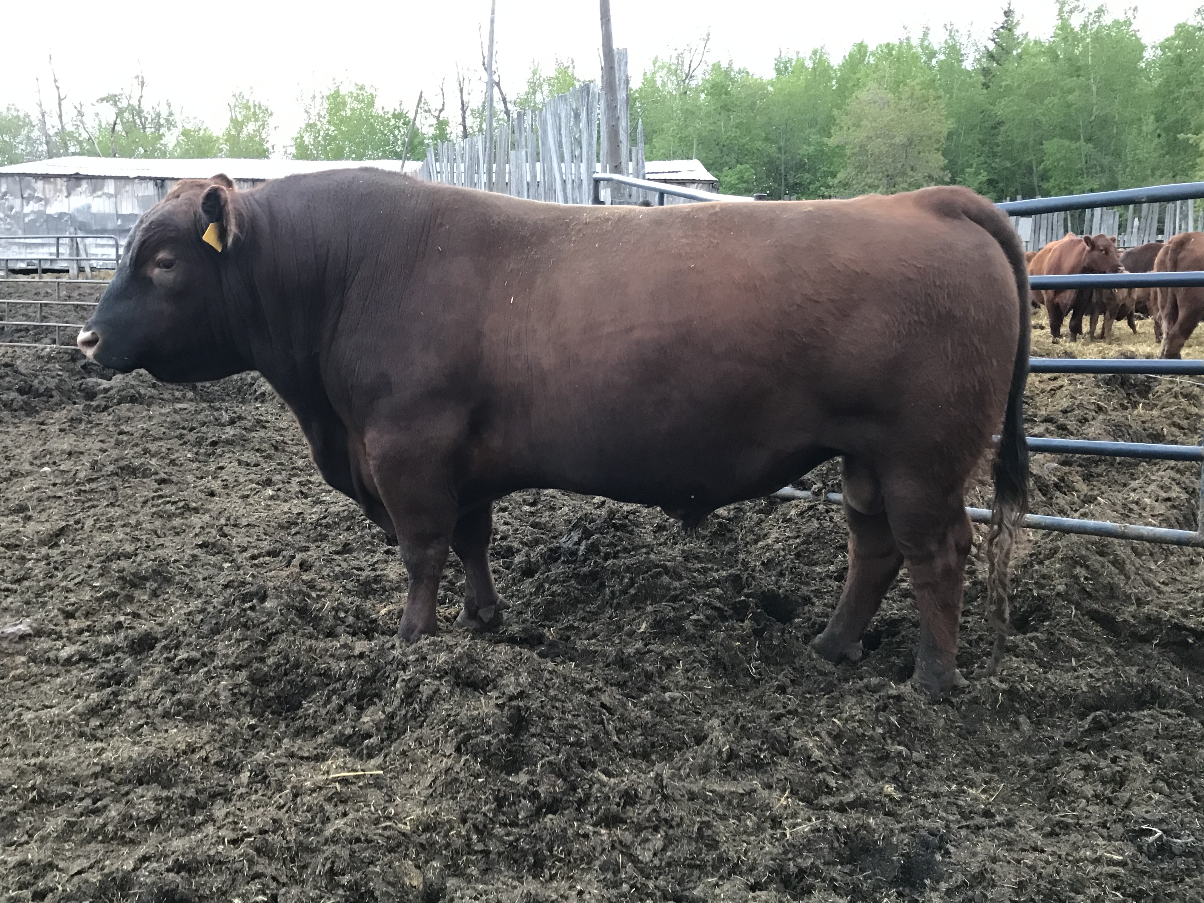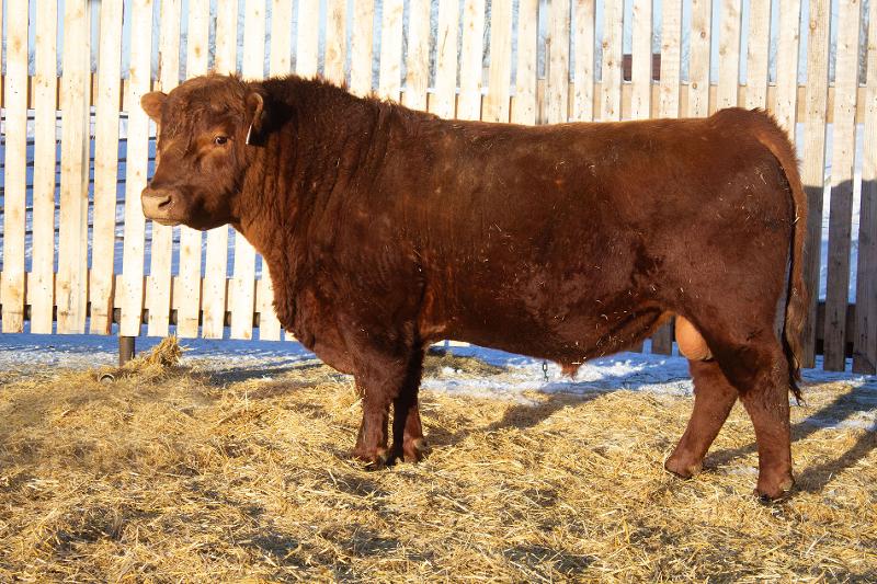 We purchased this guy from the Triple AAA bull sale from Triple H Cattle Co of Cupar, Sk in 2017. We bought him for his dark red color, his exceptional hind quarter and length of body. He is off a good, heavy set cow that went back to Red Pasquia Arab who we knew calved easy and left great females. So far he as really stamped his progeny like himself. The females are very easy fleshing with lots of body depth, beautiful udders with small teat size and do a great job raising calves both in our purebred and commercial herd. The bull calves are dark red in color with lots of body and hind quarter that calve easy.
